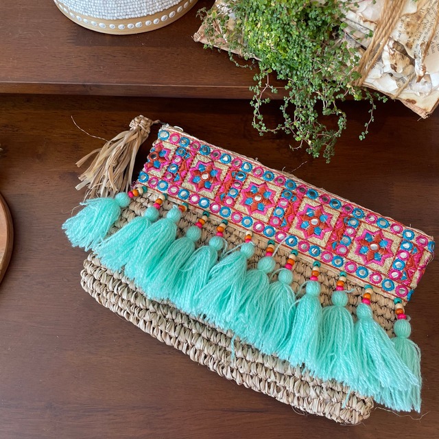Mini bag ...バリ島 BALI インドネシア リゾート ボタニカル インテリア BOHO アクセサリー ラフィア ポーチ タッセル カゴバッグ